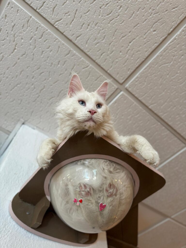 He is a breathtaking solid white Maine Coon from Siena, Italy, and a true champion. Before arriving at Paws, he enjoyed success in cat shows, winning several awards thanks to his impressive size, his perfect snowy coat, and his regal presence that makes him look like he walked straight out of a fantasy story. He was the last white Maine Coon from his cattery and was given up for adoption after the breeder decided to stop producing this rare color. Now neutered and fully healthy after recovering from a minor infection, Gandolf has traded the show ring for a softer life full of care, comfort, and well-deserved admiration.