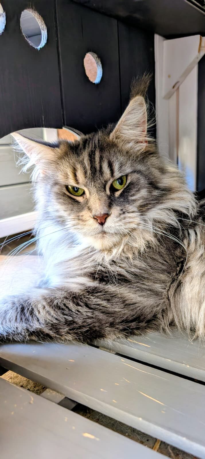 Description: Loving mother of 2 and PFAM’s queen, likes to keep her distance but loves to be brushed.