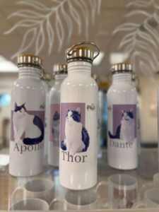 Stay hydrated in style with our durable, twist-off metal water bottle! When you pick it up at the café, choose your favorite resident cat design from our ready-made selection — each one features a cute cartoon print of one of our furry friends. Perfect for everyday use, keeps drinks cold or hot, BPA-free, and easy to clean.