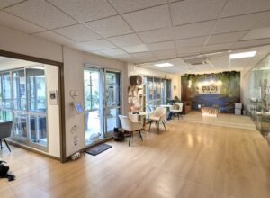 - Spacious indoor café + coworking space with lots of cat toys